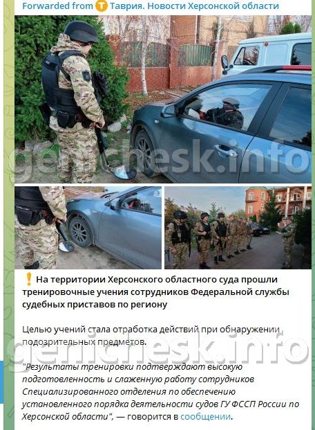 W jednym z kanałów Telegram pojawiła się informacja, że rosyjskie struktury siłowe prowadzą ćwiczenia na terenie tzw. „Chersońskiego Sądu Obwodowego FR” w rejonie Heniczeska. Do publikacji dołączono zdjęcia obiektu, który wizualnie przypominał prywatny pensjonat, a nie budynek instytucji sądowej.